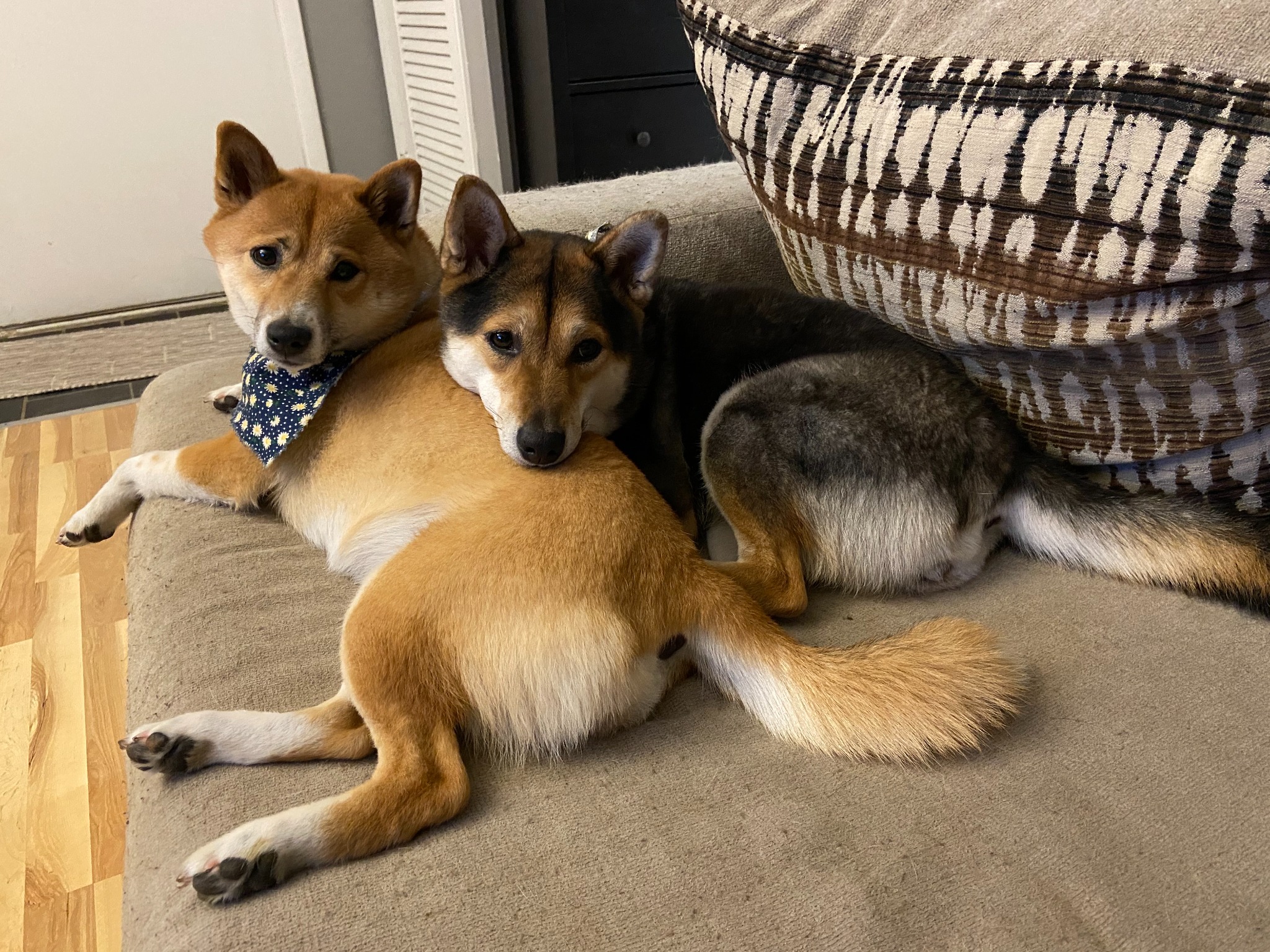 The two girls that make me a dog mom! They're both Shiba Inus, a Japanese dog breed, and they act just like cats. As a dog person, I feel a little scammed, but they've weaseled their way into my heart so it's too late.